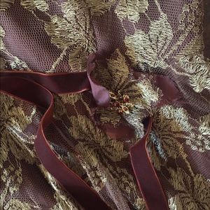 Very nice gold lace with maroon under. Great shape has cute ribbon belt with cute flower with embellishments. Not brand listed prince not firm make a offer !!