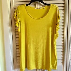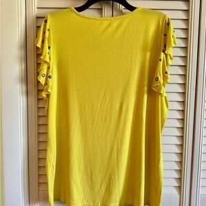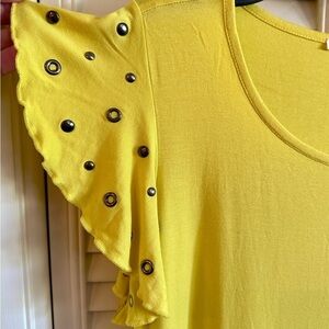 CYRUS, BRIGHT YELLOW TEE SHIRT WITH STUDDED, FLUTTER SLEEVES. SIZE XL