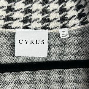 This is a stylish CYRUS Coatigan in size M for women, featuring a black and white houndstooth pattern in a long length. It has an open front design with pockets, made of 50% Nylon, 30% Viscose, and 20% Polyester. The coatigan is from the CYRUS brand and is a contemporary piece with a city theme.