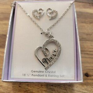 This set includes a heart-shaped pendant necklace with the word "Nana" written in cursive and embellished with crystals, along with a pair of matching heart-shaped stud earrings. The set has genuine crystals and is packaged as an 18 ½" pendant and earring set.