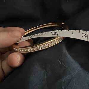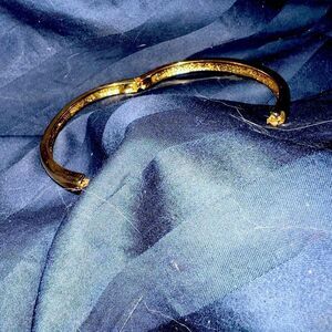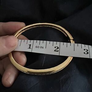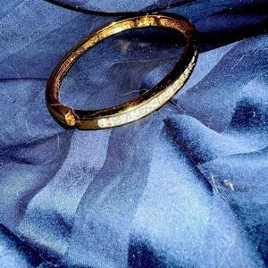 Chased on inside, hinge clasp keeps it secure. Feels heavy and real although costume. Gold-toned “diamond” (cz) bangle with hinge clasp. Perfect for office or event.