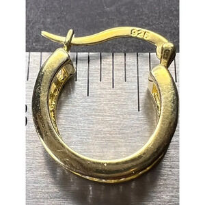 Channel set baguette white/ colorless cubic zirconia stones in a yellow gold plated over sterling silver setting. Hinged pierced locking closure. Measured just under .75 of an inch in diameter. YGI China 925 stamps