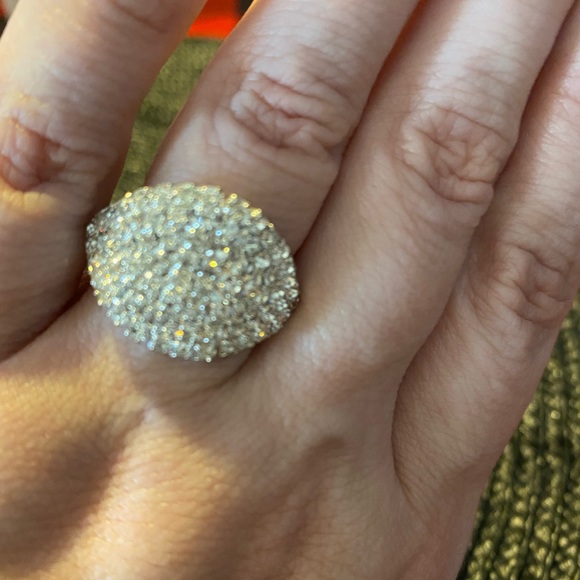 Clear cz’s in an adjustable silver tone band. Low profile ring, easy to wear w/ gloves. Bold designer look