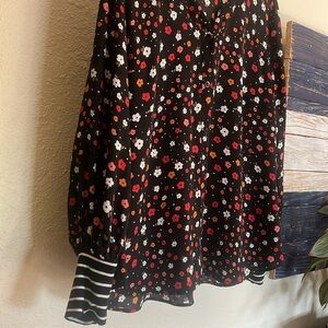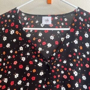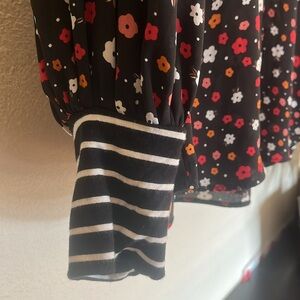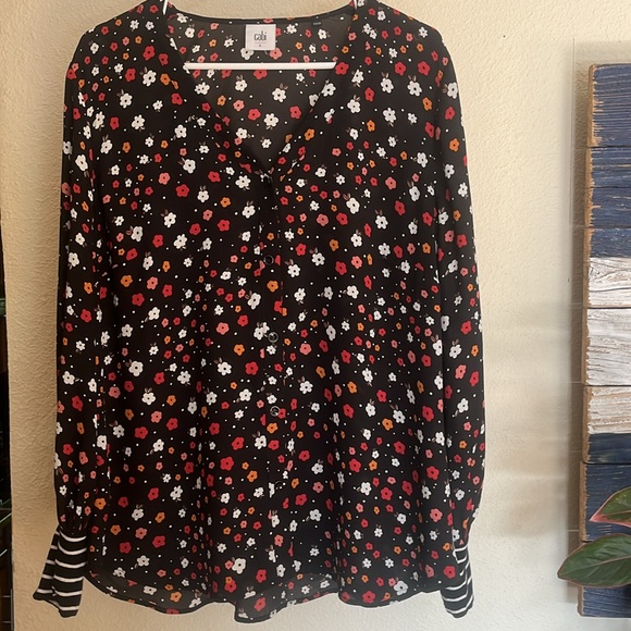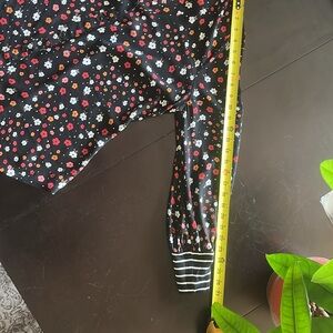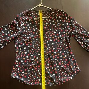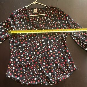 Fun shirt! %100 polyester, v-neck button down. Like new condition. Super cute cuffs on sleeve give this a great punch of fun.