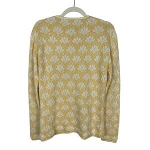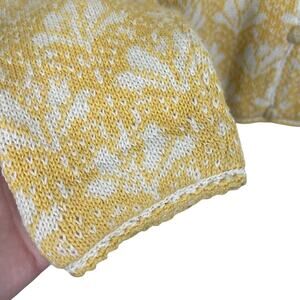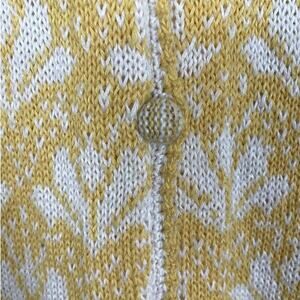 Beautiful hand made cotton floral sweater cardigan. Button front with yarn covered buttons. Long sleeves with crochet trim cuffs. So soft. Yellow/white. Size large. Please see photos for measurements.