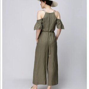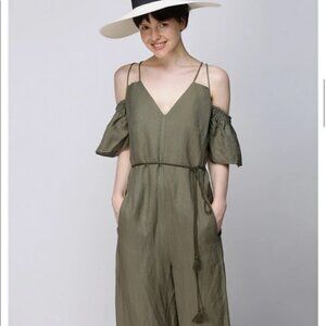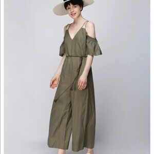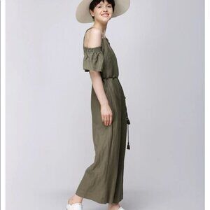 army green jumpsuit that features wide pants and double spaghetti straps. Designed with off-the-shoulder cinched sleeves.