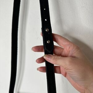 Dimensions are approximate: Height 7", Length 7", Width 3.5" + Strap 21.5" drop with 4 tabs Style Description: Suede rainbow effect bag, interior side of flap lined in navy suede, body and strap in black suede, lined in black chambray, interior patch pocket, adjustable strap, magnetic snap closure, hardware in gold. Made in Los Angeles.