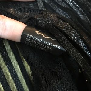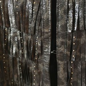 I love this luxury black leather fringed jacket made by Caban Romantic, but I don't get to wear it often. It's very edgy yet chic! It completes any outfit! Genuine leather strips over mesh fabric on top and the bottom is fringed leather accented with tiny metal studs. Hook & eye closures. No pockets. Rare long sleeves edition. Excellent condition. Made in Italy. No size tag but fits a Small. Retails for $1,200.
