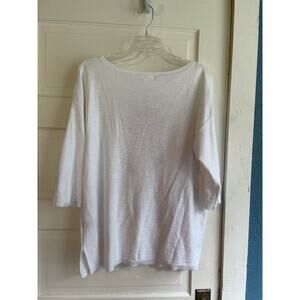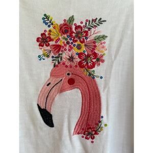 Cabana Bay women's 1/2 sleeve sweater in 100% cotton. It is white with a pink flamingo embroidered on front. Crew neck. Size XL
