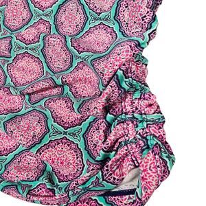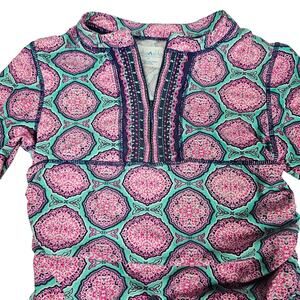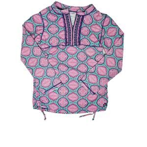 This is a long sleeved rash guard from Cabana Life in the Azalea Shores pink and aqua pattern. It features an embroidered placket with an invisible zipper. Ruched sides with strings can create either a shirt or a dress. This piece has an UPF of 50+. It's in EUC, in a girl's size 6x.