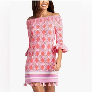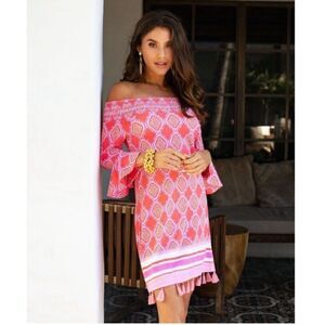 Bright and breezy Cabana Life SPF 50+ dress in a coral and pink geometric print. Off-the-shoulder neckline with ¾ bell sleeves and playful tassel trim at the hem. Lightweight, breathable, wrinkle-resistant fabric—perfect for travel, resort wear, or a stylish day in the sun.