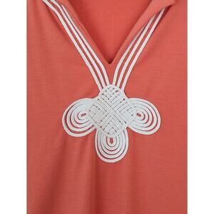Features and description: Coral Tides French Terry dress; short sleeves; soutache embroidered detail; shift style; coral pink orange and white