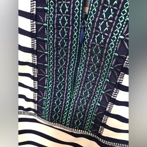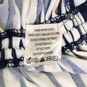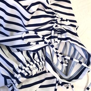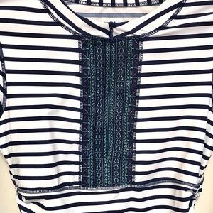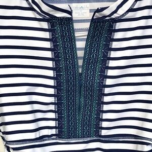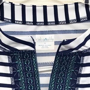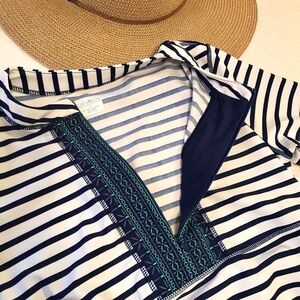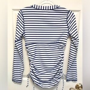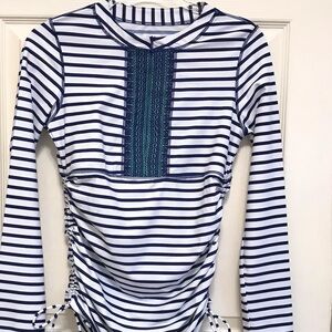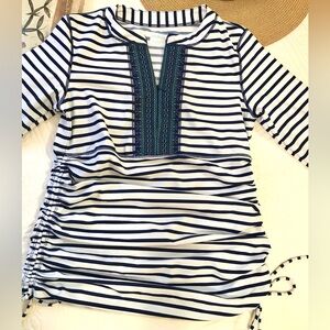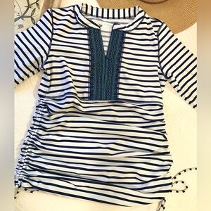 Cabana Life embroidered ruched rash guard is in EUC. Classic navy and white stripe with a lovely embroidered zip front panel. Flattering adjustable side ruching allows you to customize length and fit. UPF 50+ quick dry fabric is perfect for a day on the boat, at the beach, pool or paddle boarding. 17.5” from underarm to underarm and 26” from shoulder to hem (as shown ruched-can be adjusted longer and shorter). Smoke free home.