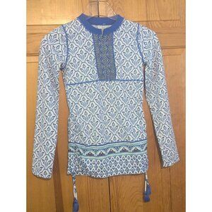The Cabana Life Girls Rash Guard in size 10 ( size tag missing) Bust measures 13 1/2 flat across. Cabana life size chart for girls is last pic of listing.zipper neckline also! This is a stylish swim shirt featuring a geometric blue pattern with embroidered details. This long-sleeve athletic top provides UV protection and stretch, making it perfect for beach days and water activities. Made from a comfortable blend of nylon and spandex, this rash guard is designed to stand out with its colorful and preppy theme, ideal for young girls looking to make a splash in the water.