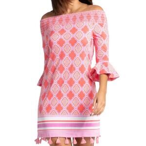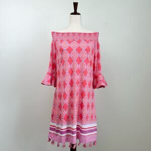 NWT Size Large Cabana Life dress. Off shoulder neckline with stretchy smocking. Cute tassel trim on the bottom hem. Three-quarter length sleeves with ruffle cuffs. No flaws, new with tags!