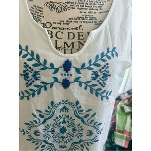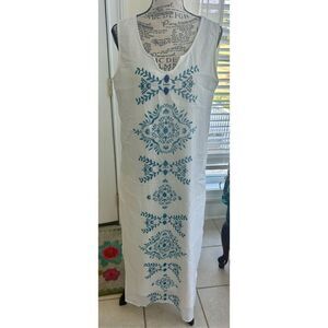 A beautifully embroidered maxi dress. Featuring two flatting side slits, a relaxed silhouette & V-neckline, our White Embroidered Side Slit Maxi is the perfect dress to get sunset drinks. This versatile style can also be worn as a cover up – just throw it on over a UPF 50+ swimsuit. Lining 100% polyester jersey. Shell 100% cotton voile