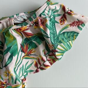 Cabana del Sol palm floral off the shoulder one piece swimsuit. Ruffle detail at the top and shelf bra interior.