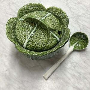 Cabbage Leaf Tureen Set. Tureen, Lid, Ladle, Four Bowls. Ceramic from Portugal