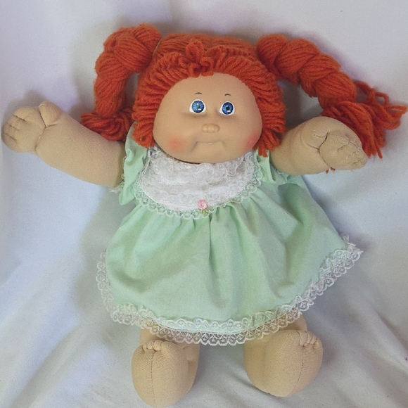 Vintage 1985 Cabbage Patch Kid Doll In Original Dress with Shorts, and one tooth. Redhead Blue Eyes.