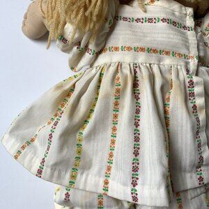 Doll and clothing has some staining. Used/played with condition. Please view photos. Doll measures about 18” in length. Yarn hair.