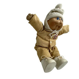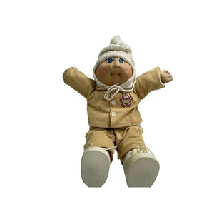 This Cabbage Patch Kids doll from 1982 is a timeless play companion. The 16 inch gender-neutral doll has a light complexion, blue eyes, and no hair. It comes with a brown bear outfit made of corduroy and a bonnet with a cord. The doll is an original, licensed reproduction and is perfect for all occasions, from playtime to display.