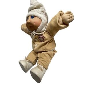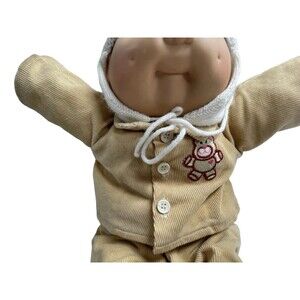 This Cabbage Patch Kids doll from 1982 is a timeless play companion. The 16 inch gender-neutral doll has a light complexion, blue eyes, and no hair. It comes with a brown bear outfit made of corduroy and a bonnet with a cord. The doll is an original, licensed reproduction and is perfect for all occasions, from playtime to display.