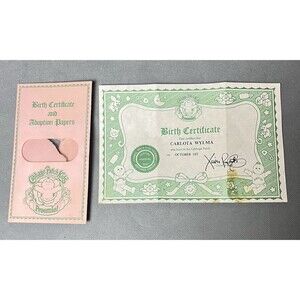***Excellent condition, no visible issues to Doll, clothing, shoes. Has original diaper. Includes Original Birth certificate, 1 year Birthday cards and more paperwork. See photos as there was a stick glue that did affect some of the paperwork and envelope. has a mint green handmade blanket as well.