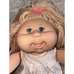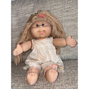 The product is a vintage Cabbage Patch Kids doll from the 1980s, specifically the girl doll named "Lulu" with blonde hair and blue eyes. This collector toy comes with clothes and a Hello Kitty charm, making it a nostalgic piece for teens, adults, and youth who were fans of the Cabbage Patch Kids brand. Made of cloth, this doll reflects the theme of babies and is an original piece from the 1980s, adding to its appeal as a vintage find. Perfect for all occasions, this Caucasian girl doll is a must-have for collectors of vintage toys.