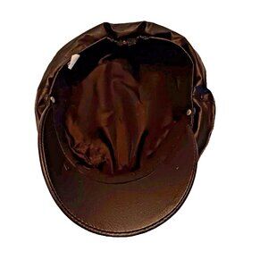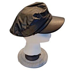 This is a black Cabbie Newsboy Cap made of nylon & vinyl materials. It is a unisex hat with a medium size and a flex fit. The cap is suitable for travel & casual occasions during the summer, fall, and spring seasons. It has a classic theme and a solid pattern. The cap is not signed or personalized, and it is not handmade. It is lined & made in China.