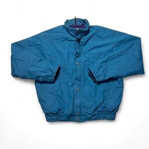 Teal Blue Green waterproof Shell with Thinsulate lining , Purple Polartec fleece lining , zip and snap front , patch logo / good pre owned condition , some minor faint discoloration around the sleeves / tagged Large , Please check all measurements before purchasing