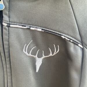 Embrace the great outdoors with this Cabela's Buck Logo Hoodie in a versatile medium size. Designed with practicality in mind, this full-zip windbreaker in classic black is tailored for the hunting enthusiast. It features a prominent logo accent, adding a touch of brand identity to the functional design.