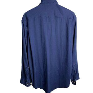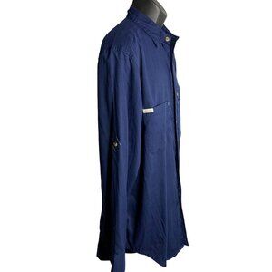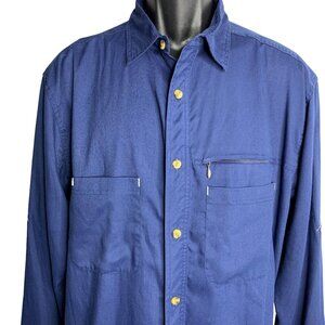Cabelas Button Up Camp Hiking Shirt L Blue Zip Pocket Roll Tab Long Sleeves