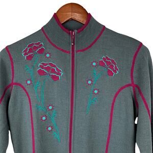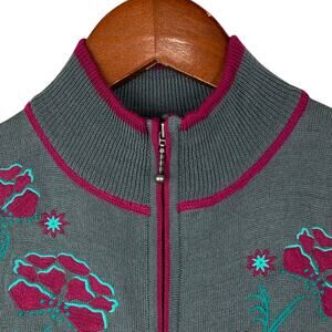 Cabela's cardigan sweater in women's size small. Full zip. Long sleeves. Grey with purple pink color flowers. Mock neck. 50% acrylic 50% merino wool. Hand wash. Excellent condition!