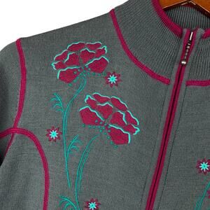 Cabelas Cardigan Sweater Full Zip Grey Purple Flowers Merino Wool Knit Women's S