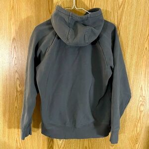 This hoodie is heavy and warm, is dark gray with front kangaroo style pocket. There’s a small spot on the front, pictured.