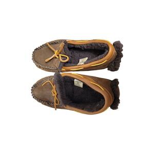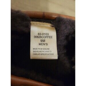 Get cozy with these Cabela's slippers that are perfect for any casual occasion. The coffee brown leather upper material is complemented by a shearling fur lining and insole material, making them warm and comfortable to wear during any season. The solid pattern and round toe shape add to their stylish design, while the leather outsole material ensures their durability. These men's shoes have a flat heel height of under 1 inch and are available in size 9. These slip-ons are an excellent choice. May contain minor wear. Please see all photos for details.