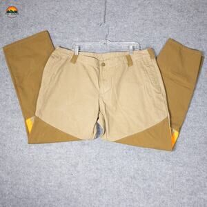 These brown Cabela's hunting pants for men are designed for upland brush hunting. The pants have a double knee for durability and appear to be designed for suspenders. They have multiple pockets and are a two-tone brown color.