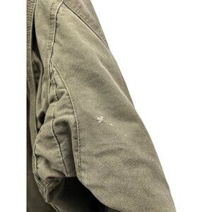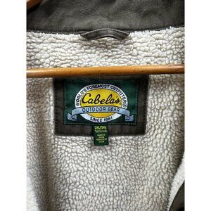 This Cabela's jacket, designed for men, combines rugged style with practical functionality. The olive green canvas exterior is durable, while the cozy sherpa lining offers warmth. The jacket is equipped with multiple pockets for convenience and a secure zip closure. A perfect blend of style and utility for outdoor enthusiasts.