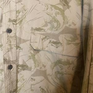 Cabela's Men's Button Up Shirt Size X-Large Vented Allover Fish Print Tan Green