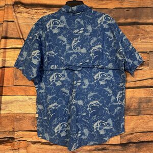 Cabela's Men's L Blue Fish Pattern Short Sleeve Vented Fishing Shirt Button Up
