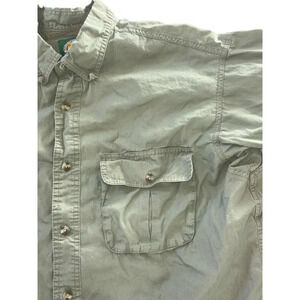 Cabelas men's outdoor button down has short sleeves and comes in the color hunter green. Vented in the back and shirt has front pockets.