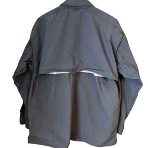 Cabela’s performance fast drying fishing shirt. The button-down, flip-up collar keeps harmful rays off your neck, a vented cape enhances breathability, and roll tabs on the long sleeves help to keep them securely rolled. Other helpful features include 2 multifunction chest pockets and rod loops.