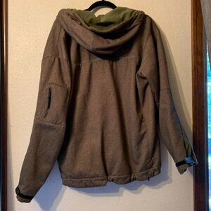 This is a nice, sturdy jacket by Cabela's. It has zippered pockets, a generous hood with a cinching toggle, and velcro on the sleeves to tighten those as well.