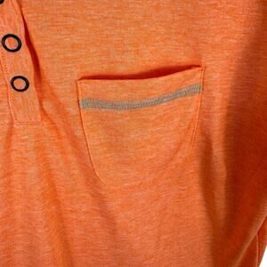 Excellent preowned condition. Orange short sleeve V-Neck 1/4 snap lightweight pullover T-Shirt. Sleeves cuff & snap. Polyester/cotton material. Approx. measurements: Shoulder to hem 27", pit to pit 22". Size L.