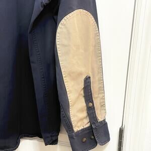 Tough enough for outdoor adventure and stylish enough for everyday wear, this Cabela's Outdoor Gear men's long sleeve shirt in Size XL features a durable heavyweight cotton construction in deep navy blue with tan canvas-style elbow patches. Designed with classic hunting and outdoor utility, it includes double front button-flap pockets, a bold embroidered duck graphic on the chest, and a Cabela’s “Certified Destination” patch on the sleeve. The long sleeves offer adjustable button cuffs and reinforced elbows, making this a great choice for layering in cool weather or sporting solo in mid-seasons. Made in Macau and built to last, this piece delivers comfort and classic Cabela’s quality.