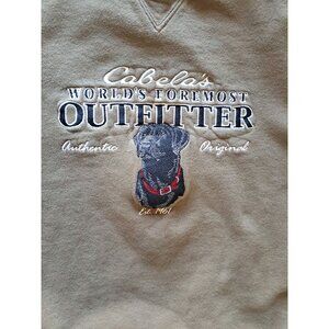 This Cabela's sweatshirt showcases an embroidered dog design and is crafted from a blend of cotton and polyester, offering both comfort and durability. Its classic fit and neutral color make it suitable for various casual settings.