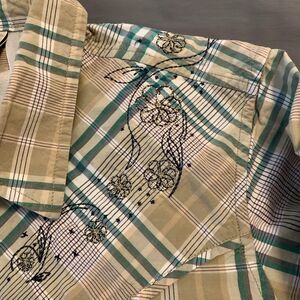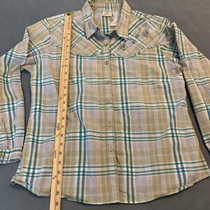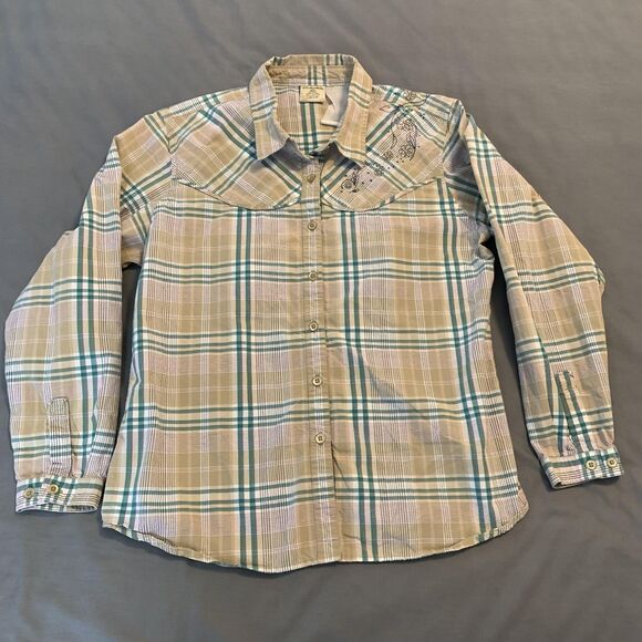Cabelas Shirt Womens XL Beige Green Plaid Western Embroidered Floral Cotton