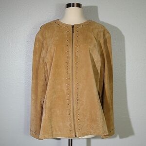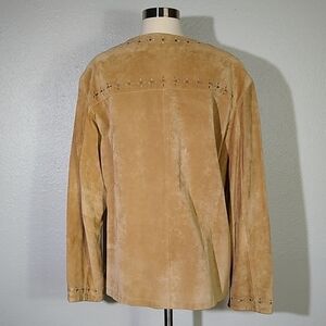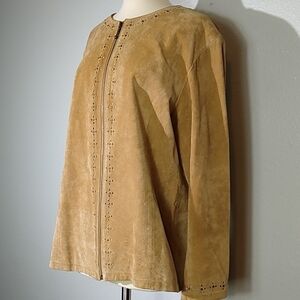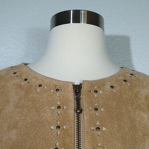 Starburst cutouts with an antique gold tone stud adorn the front, back and cuffs of this beautiful suede leather jacket