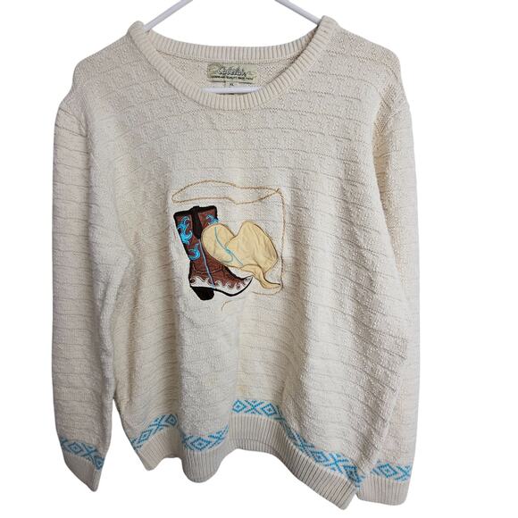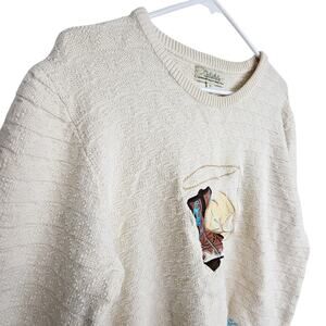 Cabelas Sweater Knit Sweater Women XL Cream Cowboy Print Pullover Sweater Women