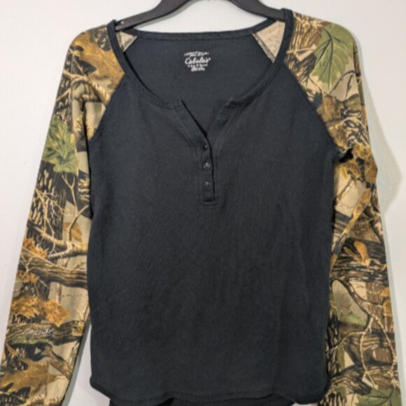 Cabela's Woman’s Henley Top Black with Tree Print Sleeves, Size M